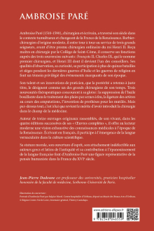 Ambroise Paré (1510-1590), chirurgien et écrivain, a traversé son siècle dans le contexte tumultueux et changeant de la France de la Renaissance. Barbier - chirurgien d’origine modeste, il entre tour à tour au service de trois grands seigneurs, avant d’être promu chirurgien ordinaire du roi Henri II. Reçu maitre en chirurgie par le Collège de Saint-Côme, il conserve ses fonctions auprès des trois souverains suivants : François II, Charles IX, qui le nomme premier chirurgien, et Henri III dont il devient l’un des conseillers. Ses qualités d’observation, sa curiosité, sa participation à plus de quinze batailles et sièges pendant les dernières guerres d’Italie et les guerres de religion en font un témoin privilégié des évènements marquants de son époque.