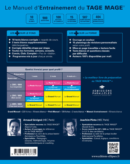 Arnaud SEVIGNE (HEC Paris) et Joachim PINTO (HEC Paris), score record de 507/600, enseignent le TAGE MAGE depuis 5 ans à AURLOM (2012-2015) et à Admissions Parallèles (2015-Auj.). Ils sont déjà auteurs d’ouvrages de référence sur le TAGE MAGE et sont reconnus comme les plus grands experts de ce test.
